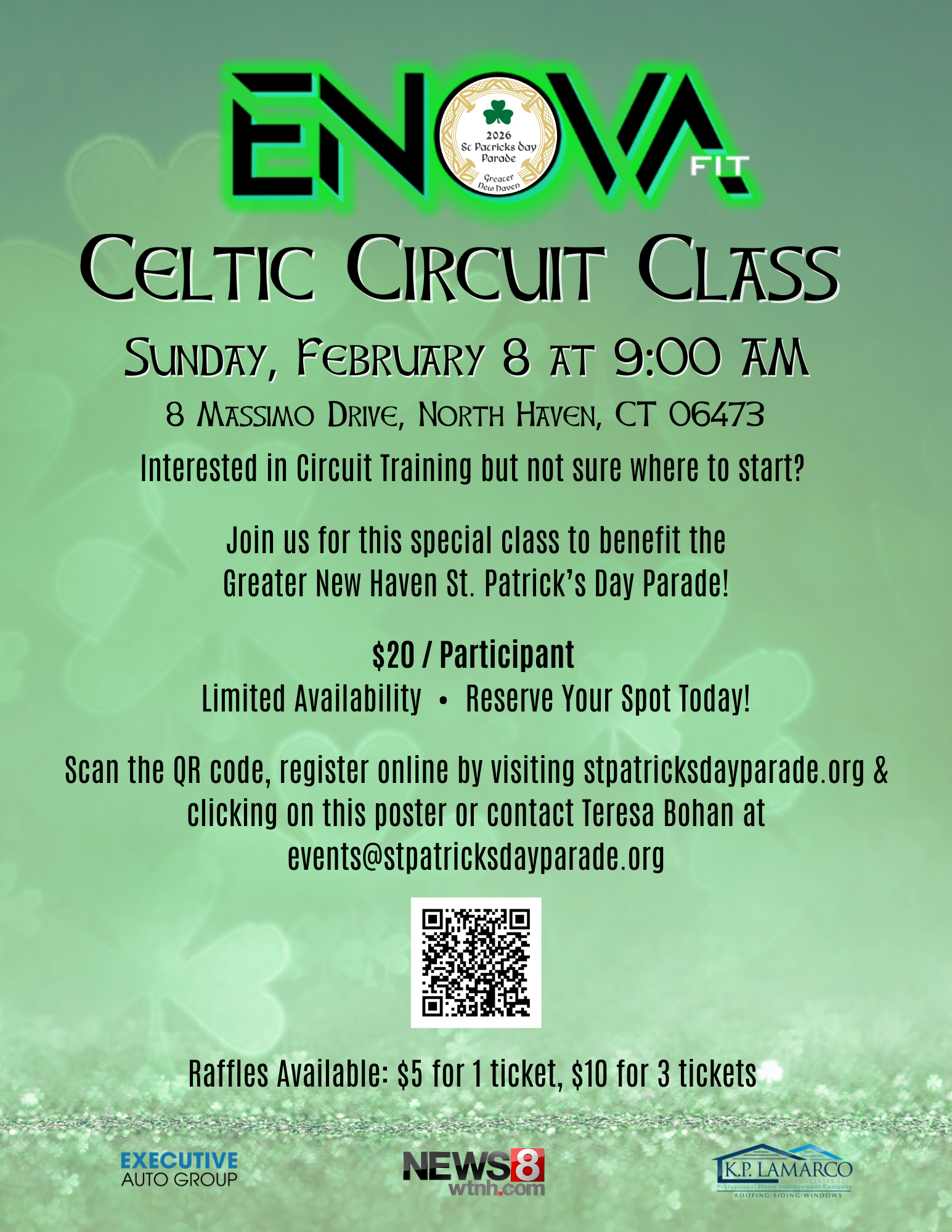 Are you ready to take your fitness journey to the next level? We are thrilled to announce the return of the Celtic Circuit Class, designed to challenge you, boost your energy, and introduce you to the trainers at Enova Nutrition & Fitness Center! We can’t wait to see you in class! Proceeds from this fundraiser support the Greater New Haven St. Patrick’s Day Parade.